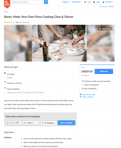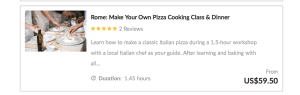 I usually start the booking process by first typing in the city and the dates for my travel in the colorful header on the homepage. After inputting that information, you will scroll down the list to see what options are available. Once you see something that you like, go ahead and select that option. In my example, I’m choosing a Make Your Own Pizza class in Rome :).