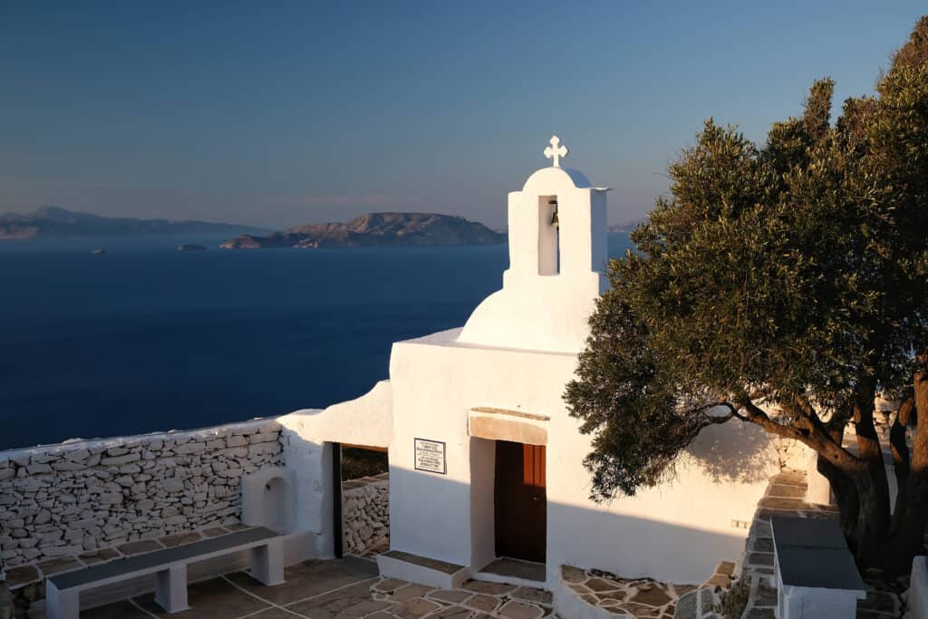 • Panagia Tourliani: This monastery dates from the 1500s and in English, is knownn as the Monastery of the Virgin Mary of Tourlos. Since restoration of the monastery in 1767, Panagia Tourliani is celebrated as the patroness of the island. Like the Paleokastro Monestery, it is built in traditional Cycladic architecture. It features a marble façade and a bell tower.